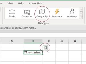 Simply enter the country’s name in a cell. Then go to the Data Types section of the data ribbon, and select Geography.