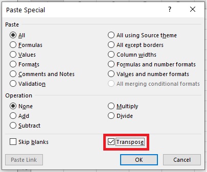 This will bring up the Paste Special dialog box. Then all you have to do is check the box for Transpose, and click OK.