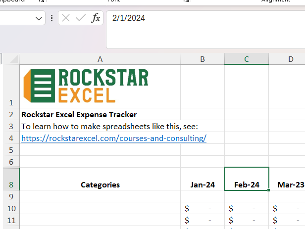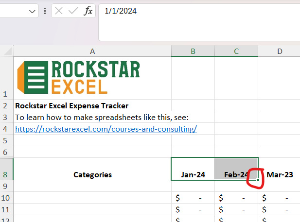 Then go to the next cell over that says February 2023 (or whatever your second month is), and change that to February 1, 2024.