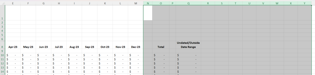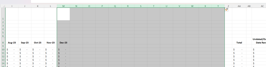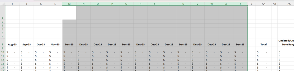 Now select the column for December 2023 (or your final month), and the 12 columns you just added. So you should have thirteen columns highlighted.