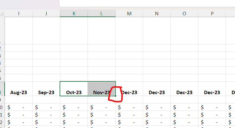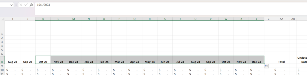 Now you’ll have 13 columns that all say December 2023. To fix this, select the cells that say October 2023 and November 2023. Then select the Fill Handle, which is the little green box in the lower right of your selection.